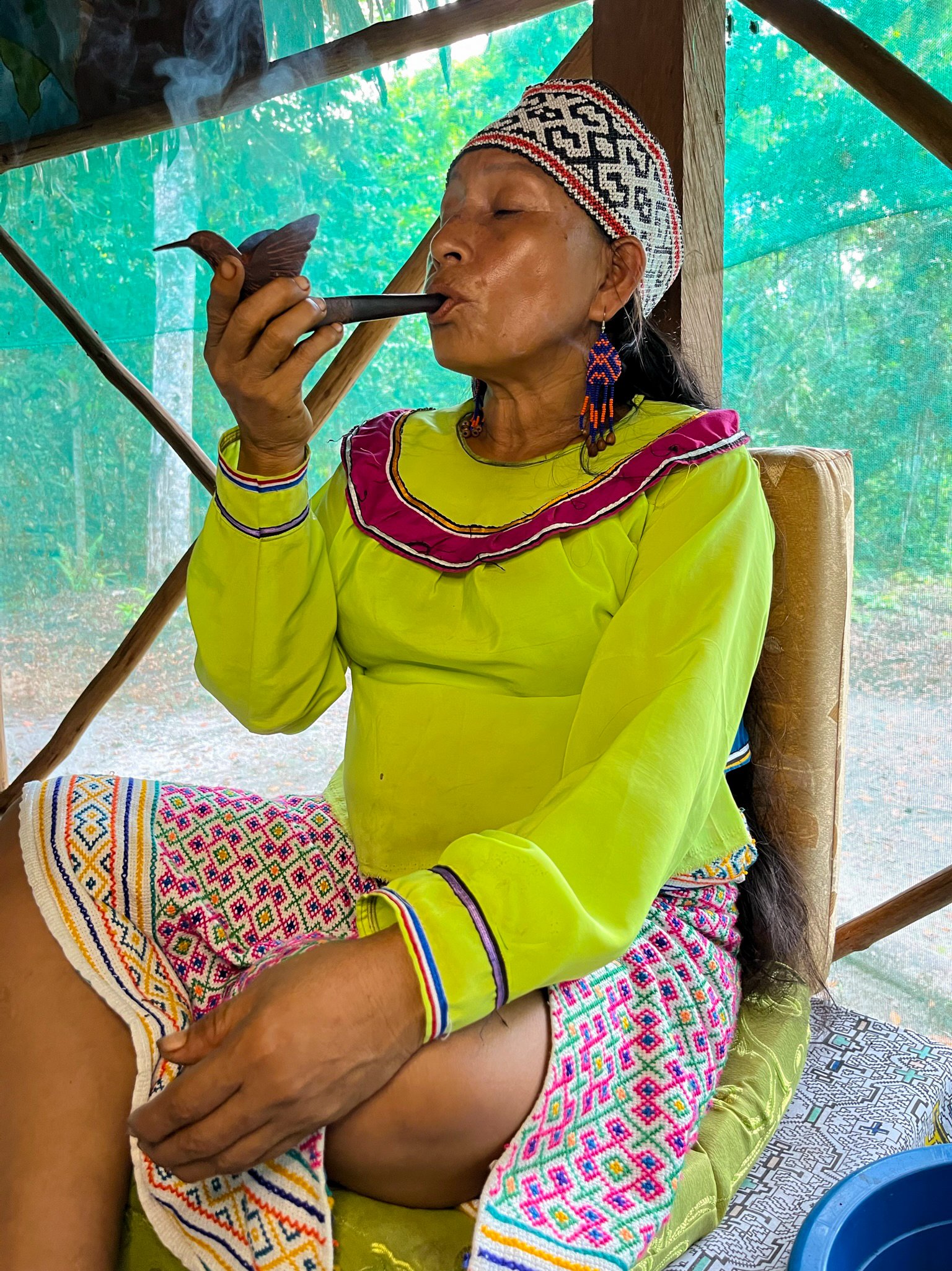 Maestra Estela comes from a Shipibo community located eight hours by boat from Pucallpa, Peru. She was born in 1972 and raised by her grandparents, both shamans and healers. As a child, she was introduced to medicinal plants and had her first encounter with Ayahuasca at the age of 14.